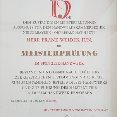 Franz Weidek jun. absolviert die Prüfung zum Spenglermeister1985